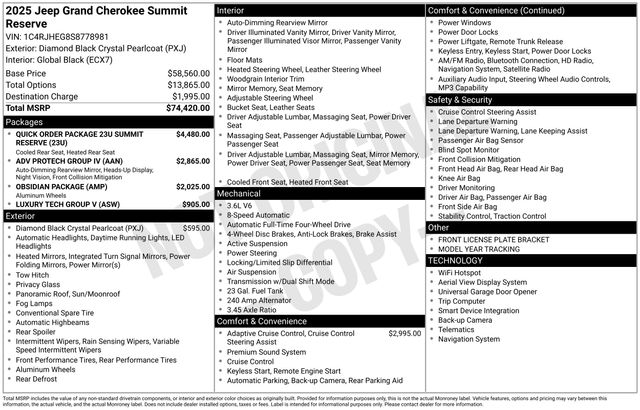 South Fork Chrysler Jeep Dodge Ram is proud to offer this gorgeous 2025 Jeep Grand Cherokee in Diamond Black Crystal Pearlcoat. This vehicle has passed our comprehensive inspection and comes with the following features: 2025 Grand Cherokee Summit 4WD, 19 Speakers High Performance Audio, 2nd-Row Manual Window Shades, 950 Watt Amplifier, Active Noise Control System, ADV Protech Group IV, Auxiliary Battery, Deluxe Headliner, Front Passenger Interactive Display, Garage door transmitter, Genuine wood dashboard insert, Genuine wood door panel insert, Gloss Black Exterior Accents, Hands-Free Active Driving Assist System, Heads-Up Display, Heated steering wheel, Luxury Tech Group V, Navigation System, Neutral Gray Exterior Accents, Painted Door Cladding, Palermo Leather Door Trim, Palermo Leather Seats, Quick Order Package 23U Summit Reserve, Rearview Autodim Digital Display Mirror, Summit, Summit Badge, Ventilated Rear Seats, Wheels: 21" x 9" Black Painted Aluminum, Wheels: 21" x 9" Machined Face/Painted Aluminum, Windshield Wiper De-Icer, Wireless Charging Pad. 19/26 City/Highway MPG