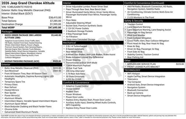 South Fork Chrysler Jeep Dodge Ram is proud to offer this great-looking 2026 Jeep Grand Cherokee in Baltic Gray Metallic Clearcoat. This vehicle has passed our comprehensive inspection and comes with the following features: 2026 Grand Cherokee Laredo 19/26 City/Highway MPG