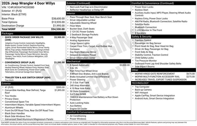 Experience the thrill of the open road and the freedom of the great outdoors in the 2026 Jeep Wrangler Willys. Schedule a test drive today and discover the true spirit of adventure that lies within. Art is for illustration purposes only. Not responsible for errors or omissions. All vehicle's are plus tax, title, license, official fees, equipment and destination fees.. Price includes: $1000 - 2026 National Retail Bonus Cash . Exp. 04/30/2026 $1500 - 2026 Southwest BC Bonus Cash . Exp. 04/30/2026 Price includes $18,886 of dealer added accessories.