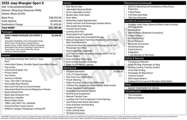 With a list price of $19,997 and only 75,065 miles on the odometer, this 2020 Jeep Wrangler Sport S represents an outstanding value in the pre-owned market. Discover the perfect blend of capability, comfort, and style schedule a test drive today and experience the thrill of Jeep ownership for yourself.