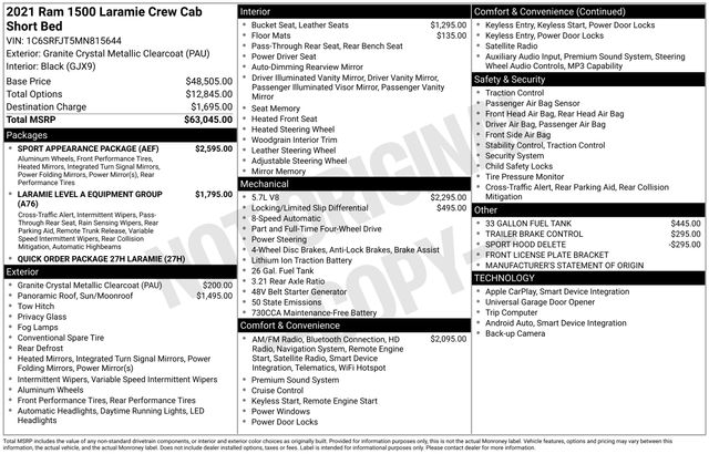 This 2021 Ram 1500 Laramie is the perfect blend of power, capability, and refined luxury. Experience the difference for yourself by scheduling a test drive today. We're confident you'll be impressed by the exceptional performance and premium features that make this truck a standout in its class.