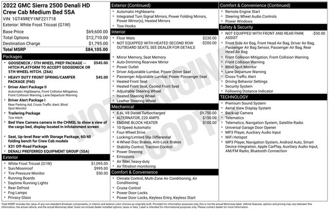 This Sierra Denali is equipped with a host of premium features that elevate the driving experience. Enjoy the convenience of the Gooseneck/5th Wheel Prep Package, which allows you to easily install a gooseneck or 5th wheel hitch, making it the perfect companion for your towing needs. The Heavy Duty Front Spring/Camper Package ensures a smooth and stable ride, even when carrying heavy loads.