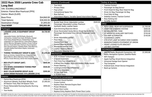 South Fork Chrysler Jeep Dodge Ram is excited to offer this fantastic-looking 2022 Ram 3500 in Patriot Blue Pearlcoat. This vehicle has passed our comprehensive inspection and comes with the following features: Odometer is 18554 miles below market average! *4WD, Turbo Diesel Power, Bluetooth, Hands-Free connection, Navigation!, Backup Camera, Cruise Control, Keyless Entry, Power Locks, Power Windows, Leather Seats, Towing Package, Apple Carplay, Android Auto, 5th Wheel Set Up, 3500 Laramie 4x4 Crew Cab DRW, 4D Crew Cab, 6.7L I6, Aisin 6-Speed Automatic, 4WD, Patriot Blue Pearlcoat, Black Leather, 12" Touchscreen Display, 17 Speaker harman kardon Premium Sound, 2 Way Rear Headrest Seat, 220 Amp Alternator, 2nd Row In Floor Storage Bins, 4 Way Front Headrests, 4-Wheel Disc Brakes, 4G LTE Wi-Fi Hot Spot, 5th Wheel/Gooseneck Towing Prep Group, 6000# Front Axle w/Hub Ext, 8.4" Touchscreen Display, ABS brakes, Adaptive Steering System, Adjustable pedals, Air Conditioning, Air Suspension Decal, Alexa Built-In, All R1 High Radios, All Radio Equipped Vehicles, Apple CarPlay, Apple CarPlay/Android Auto, Auto High Beam Headlamp Control, Auto Level Rear Air Suspension, Auto-dimming Rear-View mirror, Automatic temperature control, Bed Utility Group, Bluetooth Handsfree Phone & Audio, Body Color Bumper Group, Box & Rear Fender Clearance Lamps, Brake assist, Center Hub, Chrome Exterior Mirrors, Clearance Lamps, Connected Travel & Traffic Services, Connectivity - US/Canada, CTR Stop Lamp w/Cargo View Camera, Delay-off headlights, Disassociated Touchscreen Display, Dual front impact airbags, Dual front side impact airbags, Dual Rear Wheels, Electronic Stability Control, Electronically Controlled Throttle, Exterior Mirrors Courtesy Lamps, Exterior Mirrors w/Heating Element, Exterior Mirrors w/Memory, Exterior Mirrors w/Supplemental Signals, Foam Bottle Insert (Door Trim Panel), For Details Visit DriveUconnect.com, For More Info, Call 800-643-2112, Front dual zone A/C, Front fog lights, Fully automatic headlights, Global Telematics Box Module (TBM), Google Android Auto, GPS Antenna Input, GPS Navigation, HD Radio, Heated door mirrors, Heated Front Seats, Heated Second Row Seats, Heated Steering Wheel, Integrated Center Stack Radio, Integrated Voice Command w/Bluetooth, Laramie Level B Equipment Group, Leather steering wheel, Leather Trim 40/20/40 Bench Seat, LED Bed Lighting, Mirror Running Lights, Mirror-Mounted Aux Reverse Lamps, MOPAR Deployable Bed Step, MOPAR Spray In Bedliner, Occupant sensing airbag, Off-Road Information Pages, Outside temperature display, Overhead airbag, Painted Front Bumper, Painted Rear Bumper, Panic alarm, ParkView Rear Back-Up Camera, Power 8-Way Adjustable Passenger Seat, Power Adjust 8-Way Driver Seat, Power Adjustable Convex Aux Mirrors, Power Adjustable Pedals w/Memory, Power Chrome Tow Mirrors w/Convex Spotter & Memory, Power Deployable Running Boards, Power door mirrors, Power-Folding Mirrors, Quick Order Package 21H Laramie, Radio: Uconnect 5 Nav w/8.4" Display, Radio: Uconnect 5 w/8.4" Display, Radio/Driver Seat/Mirrors/Pedals Memory, Rain Sensitive Windshield Wipers, Rear step bumper, Remote keyless entry, Remote Tailgate Release, Security system, Selectable Tire Fill Alert, SiriusXM Radio Service, SiriusXM Satellite Radio, SiriusXM w/360L, Speed control, Steering wheel mounted audio controls, Surround View Camera System, Tip Start, Towing Technology Group B, Trailer Reverse Guidance, Trailer Tow Mirrors, Turn signal indicator mirrors, Variably intermittent wipers, Ventilated Front Seats, Voltmeter, Wheels: 18" x 8.0" Polished Aluminum.