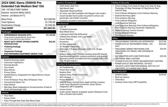 South Fork Chrysler Jeep Dodge Ram is pumped up to offer this gorgeous-looking 2024 GMC Sierra 2500HD in Summit White. This vehicle has passed our comprehensive inspection and comes with the following features: CARFAX One-Owner. Clean CARFAX. *Backup Camera, Cruise Control, Keyless Entry, Power Locks, Power Windows, Sierra 2500HD Pro, Double Cab, 6.6L V8, 10-Speed Automatic, RWD, Summit White, Black Cloth, 120-Volt Bed Mounted Power Outlet, 120-Volt Instrument Panel Power Outlet, 17" Steel Wheels, 2 Charge/Data USB Ports, 3.73 Rear Axle Ratio, 4-Way Manual Passenger Seat Adjuster, 5th Wheel & Gooseneck Trailer Wiring Provisions, 6-Speaker Audio System Feature, ABS brakes, Air Conditioning, Apple CarPlay/Android Auto, Auto High-beam Headlights, Automatic Emergency Braking, Chrome Grille w/Flat Black Grille Insert Bars, Convenience Package, Deep-Tinted Glass, Dual front impact airbags, Dual front side impact airbags, Electric Rear-Window Defogger, Electronic Stability Control, EZ Lift Power Lock & Release Tailgate, Following Distance Indicator, Forward Collision Alert, Front Pedestrian Braking, Fully automatic headlights, Heavy Duty Front Spring/Camper Package, Heavy-Duty 80 Amp Battery, Illuminated entry, Integrated Trailer Brake Controller, IntelliBeam Automatic High Beam On/Off, Lane Departure Warning System, LED Cargo Area Lighting, Manual Tilt-Wheel/Telescoping Steering Column, Occupant sensing airbag, OnStar & GMC Connected Services Capable, Outside Power-Adjustable Black Mirrors, Outside temperature display, Overhead airbag, Panic alarm, Power steering, Power windows, Preferred Equipment Group 1SA, Premium audio system: GMC Infotainment System, Push Button Start, Radio: AM/FM w/GMC Infotainment System, Remote Keyless Entry, Remote keyless entry, Solar Absorbing Tinted Glass, Steering Wheel-Mounted Cruise Control, Suspension Package, Variably intermittent wipers, Wireless Phone Projection.
